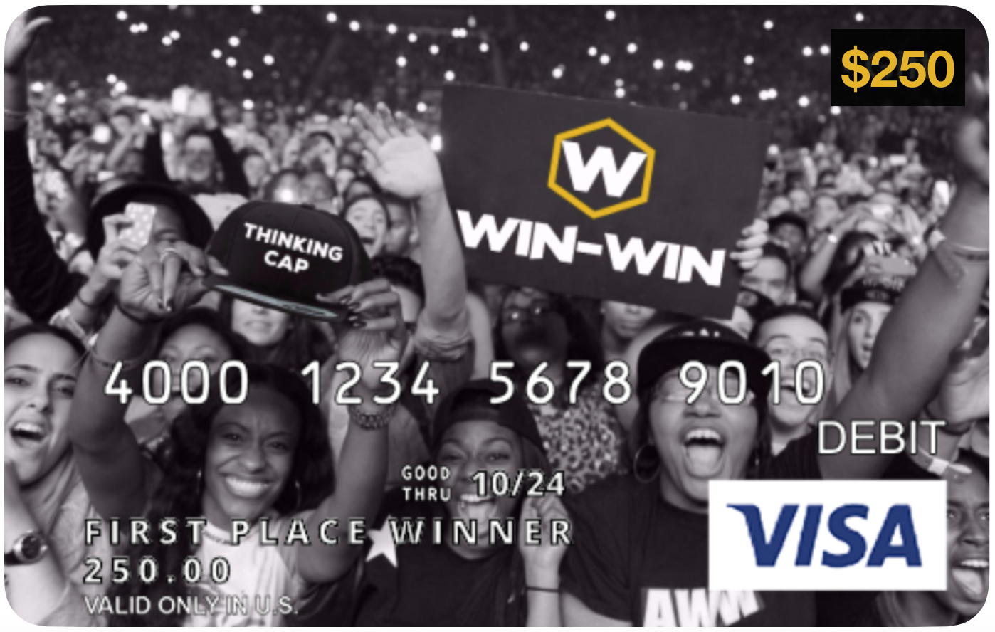 Money in the bank! Receive a custom Win-Win Visa card, preloaded with $250 for any purchase